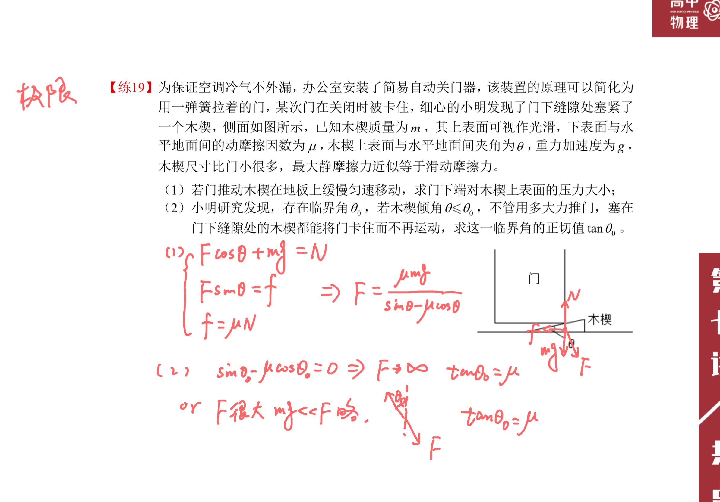 像是这道题的第2问,F很大的时候,重力可以忽略,那么物体受全反力和F一定二力平衡所以同向,说明临界摩擦因数必须满足全反力方向与F反向,与接触面垂直,也就是摩擦角必须是θ。自然就知道临界情况μ=tanθ。
